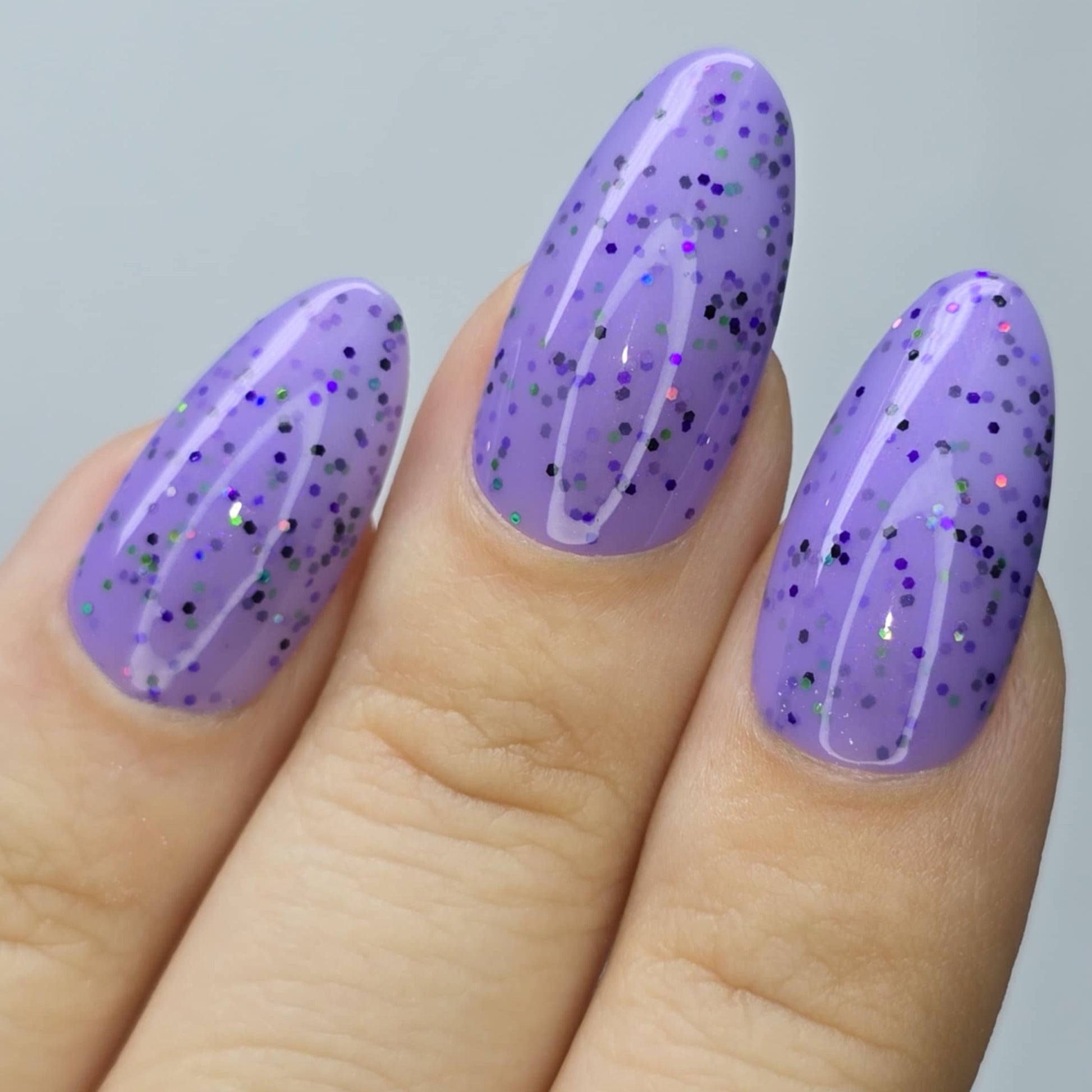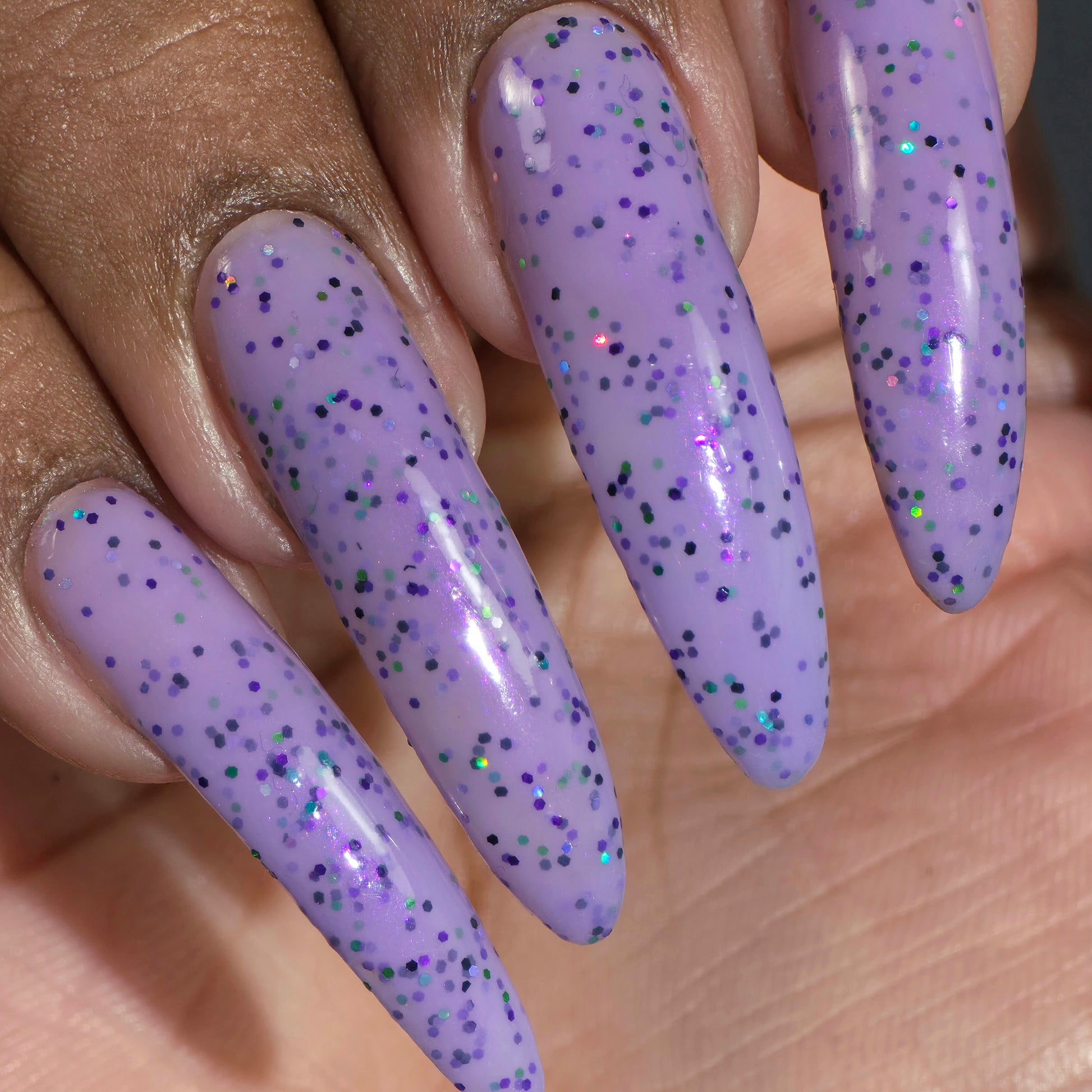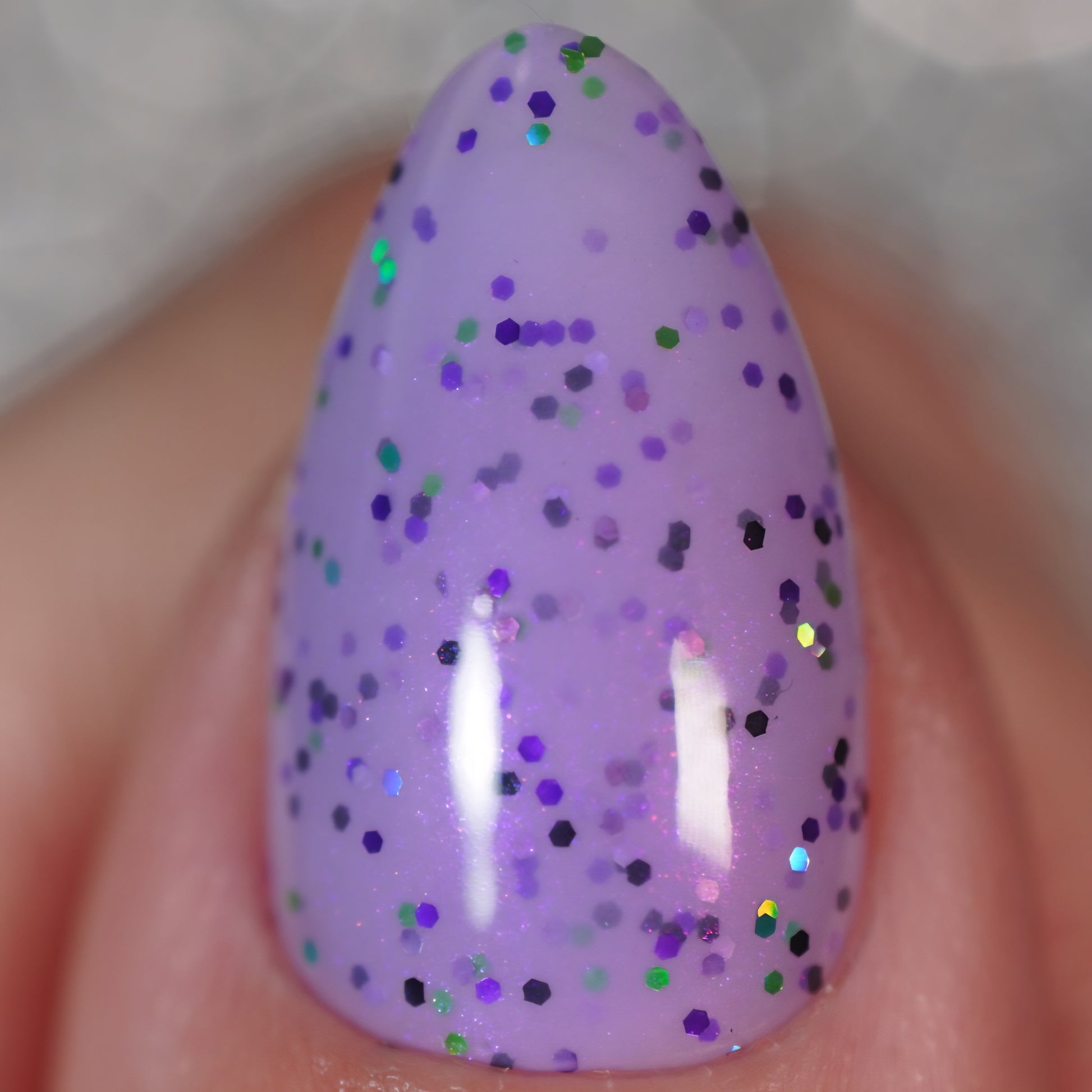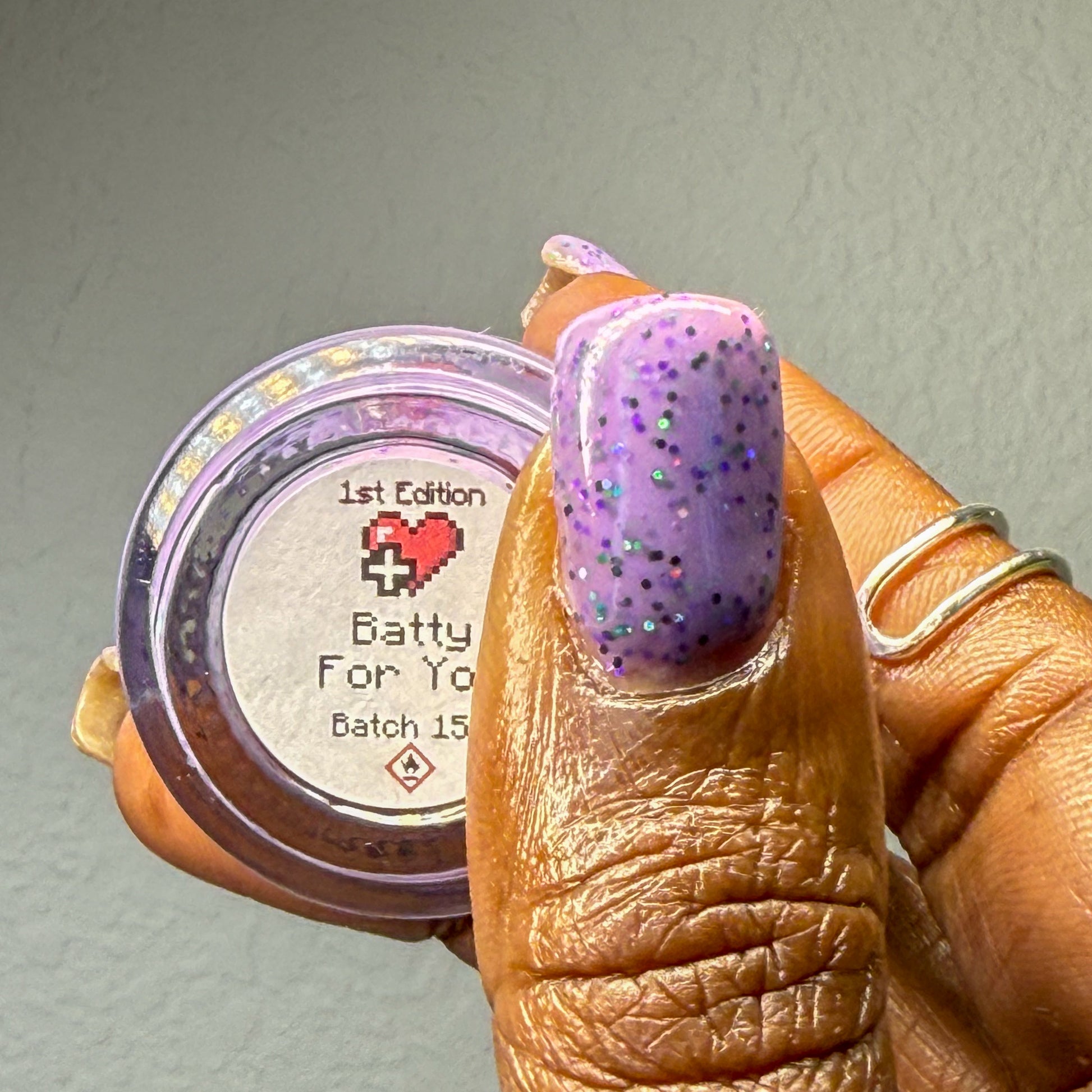 🦇Batty For You is a dusty pastel lavender crelly with vivid purple shimmer, green holo, lavender holo, purple metallic and black metallic hex glitters.