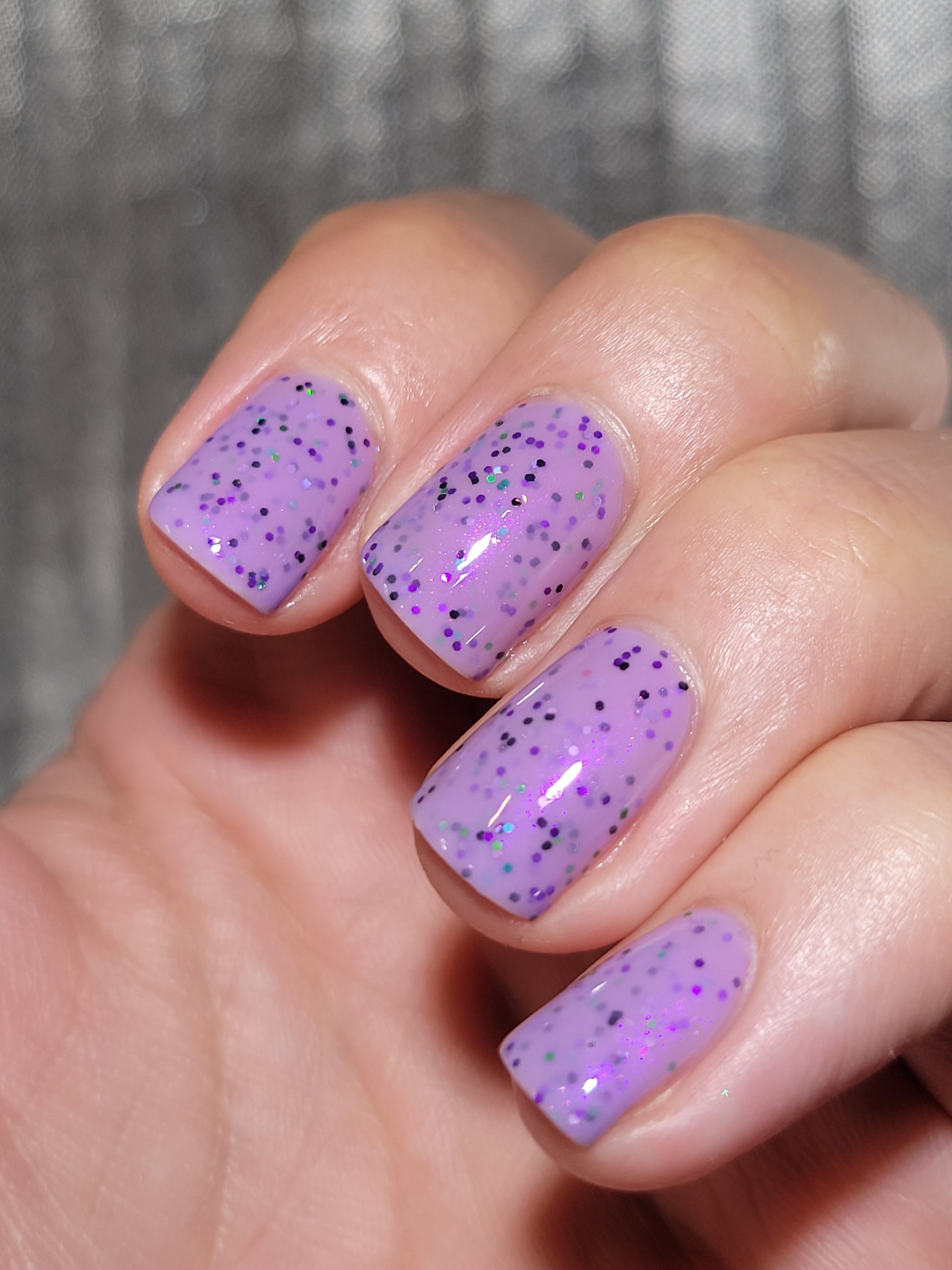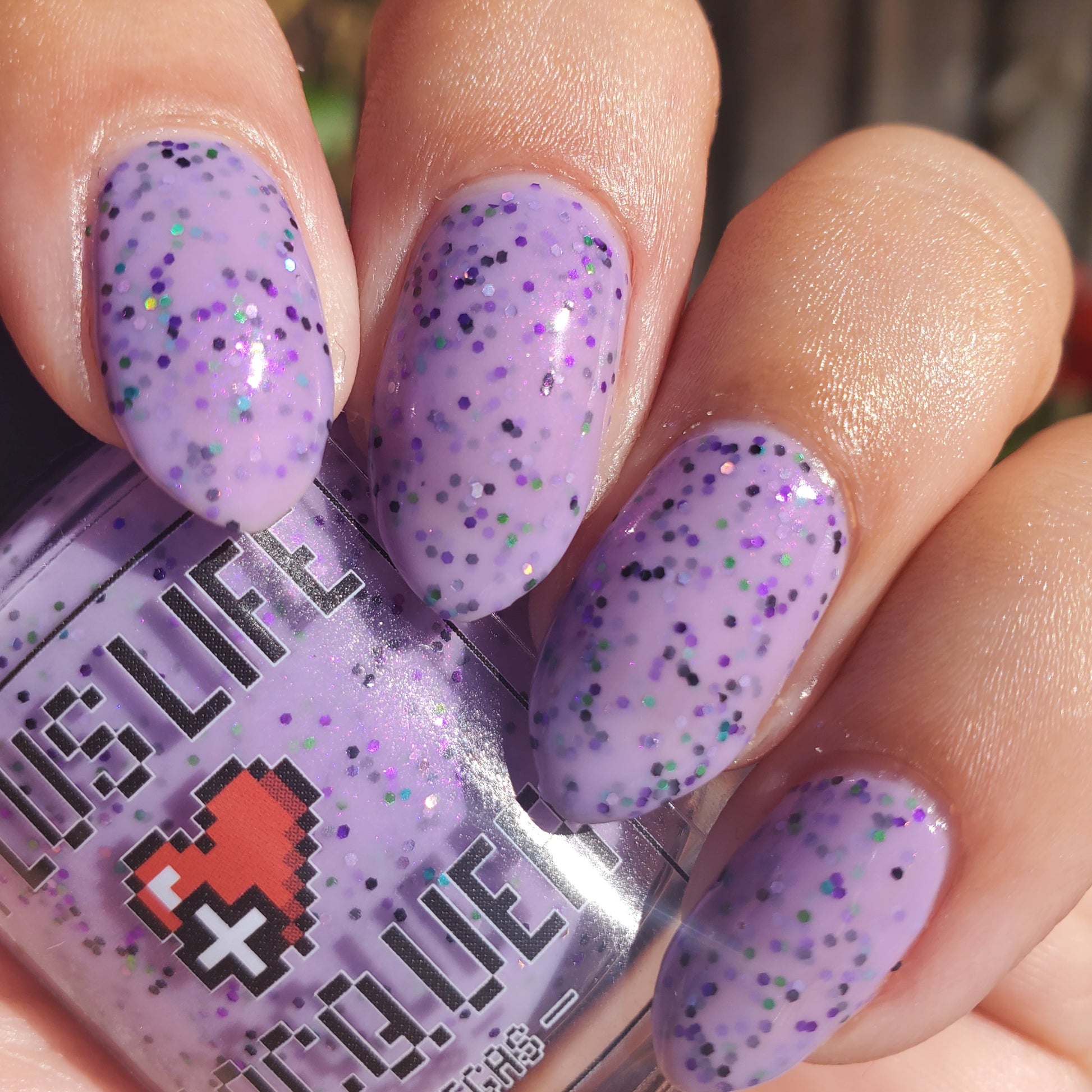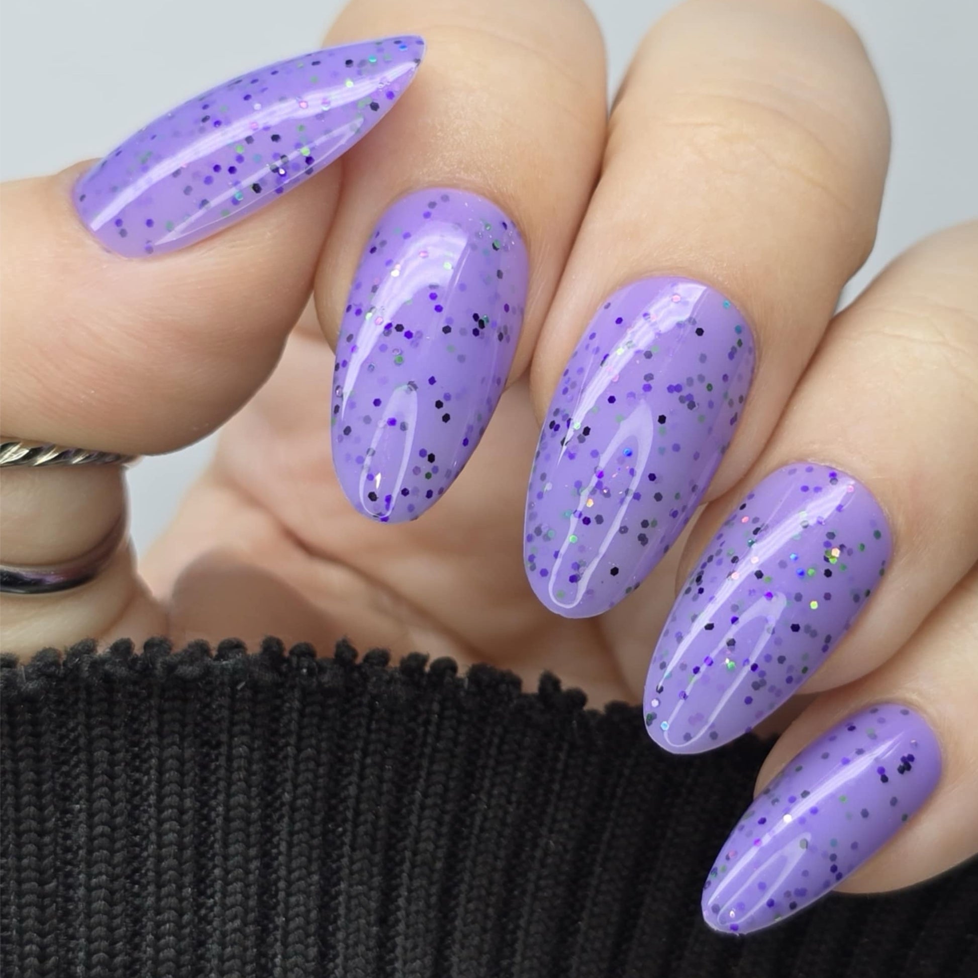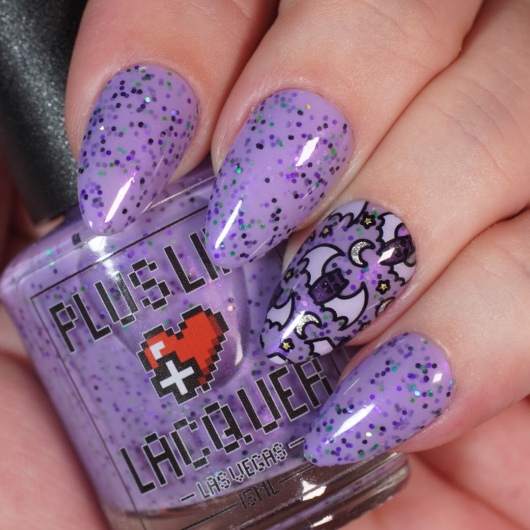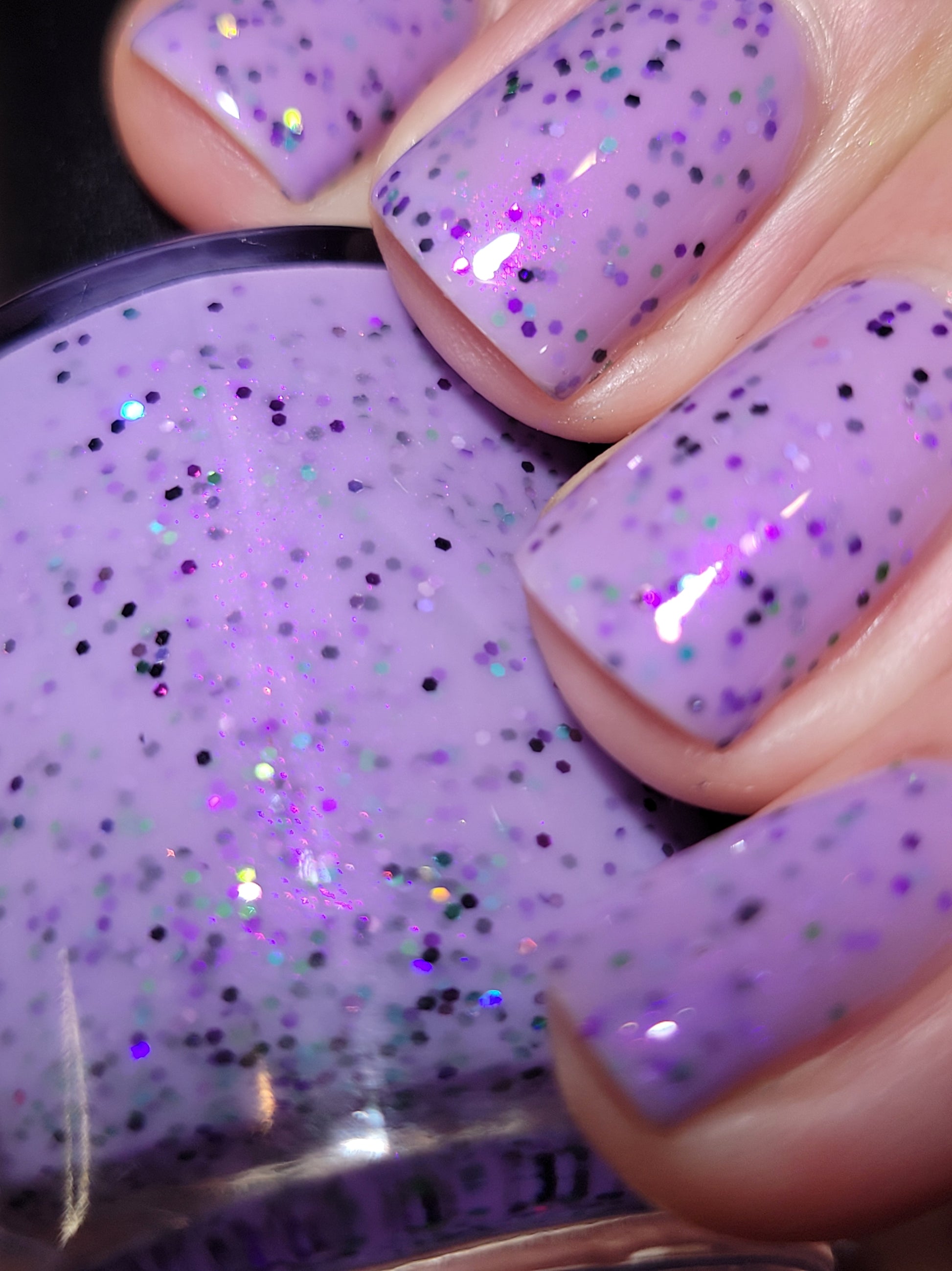 🦇Batty For You is a dusty pastel lavender crelly with vivid purple shimmer, green holo, lavender holo, purple metallic and black metallic hex glitters.