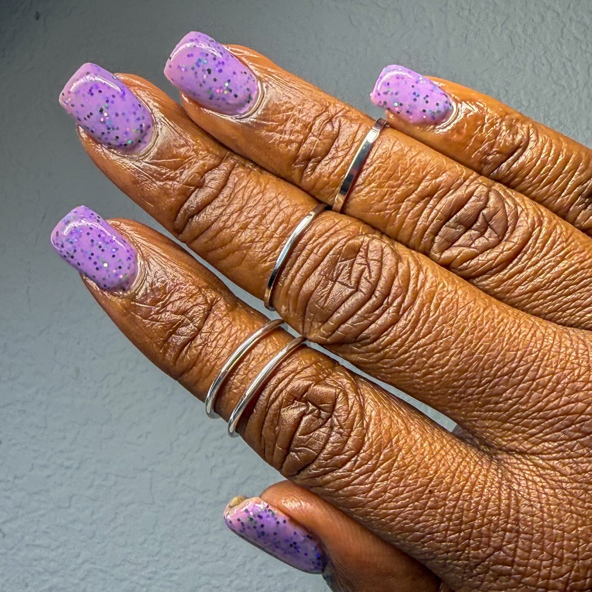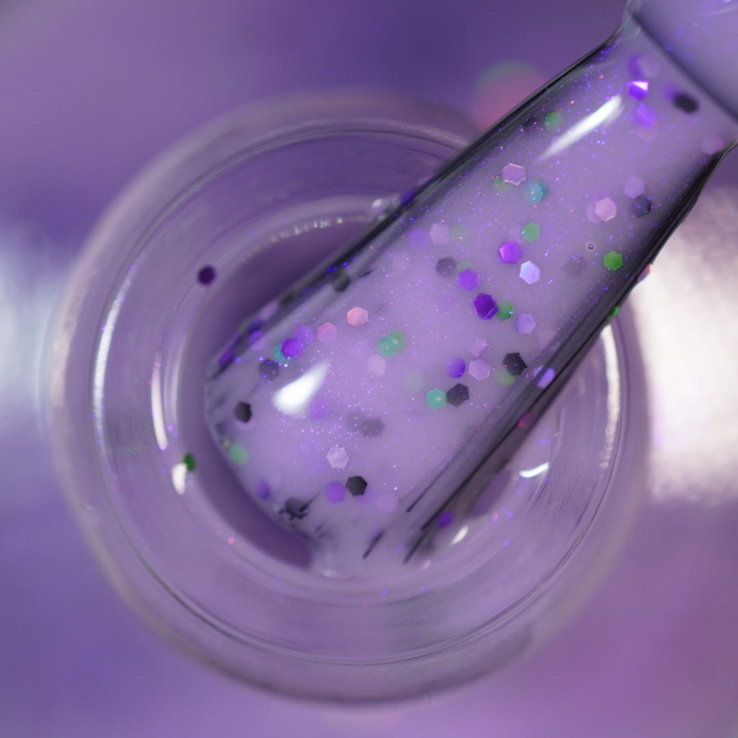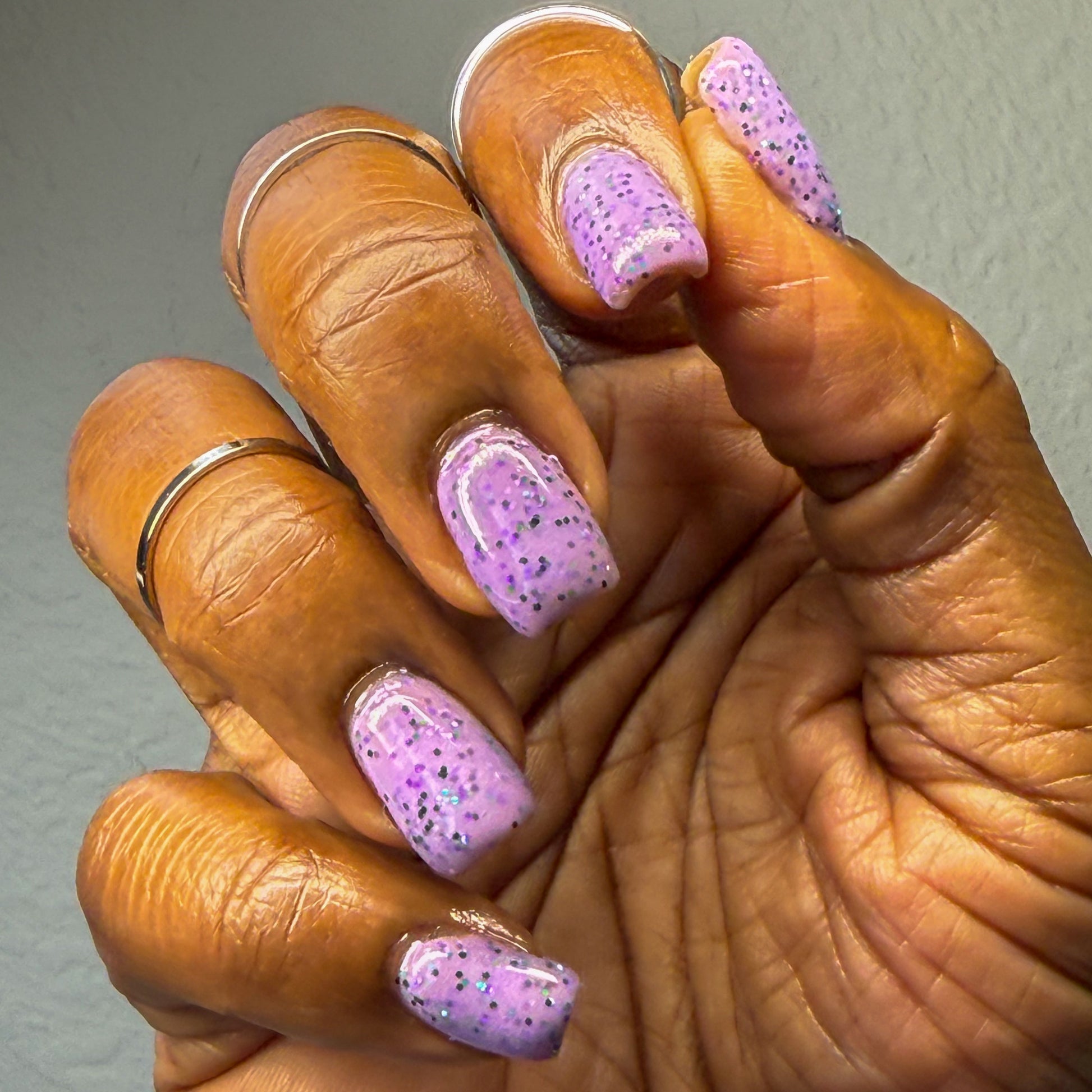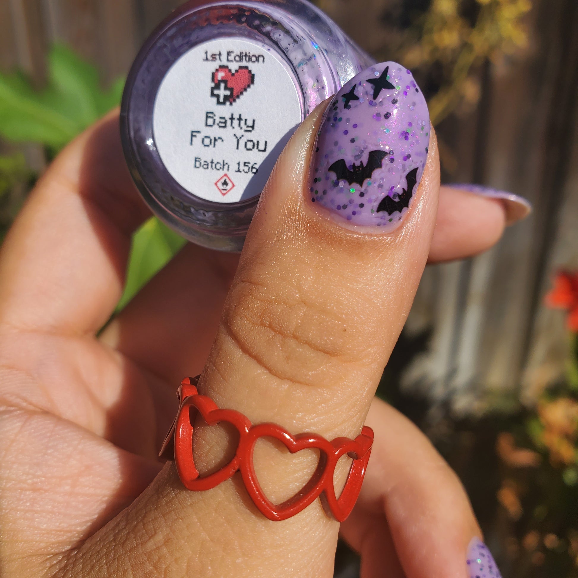 🦇Batty For You is a dusty pastel lavender crelly with vivid purple shimmer, green holo, lavender holo, purple metallic and black metallic hex glitters.
