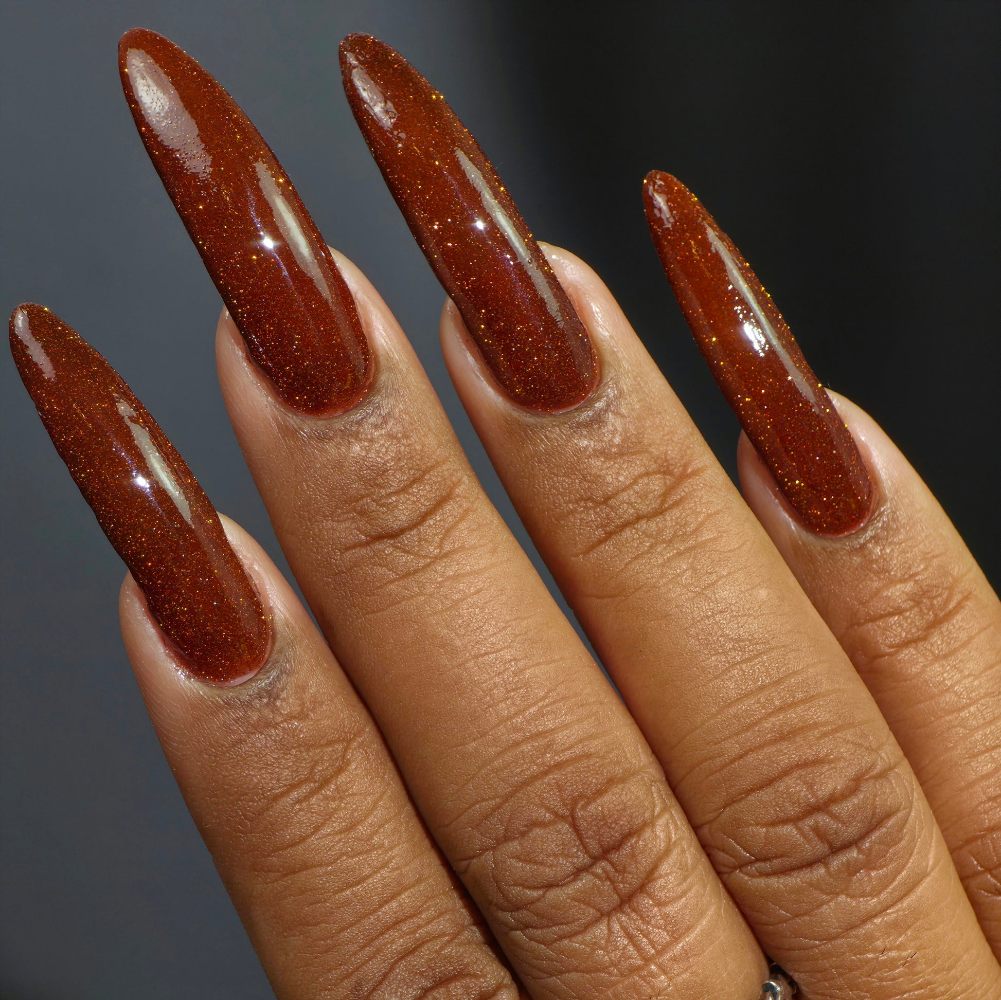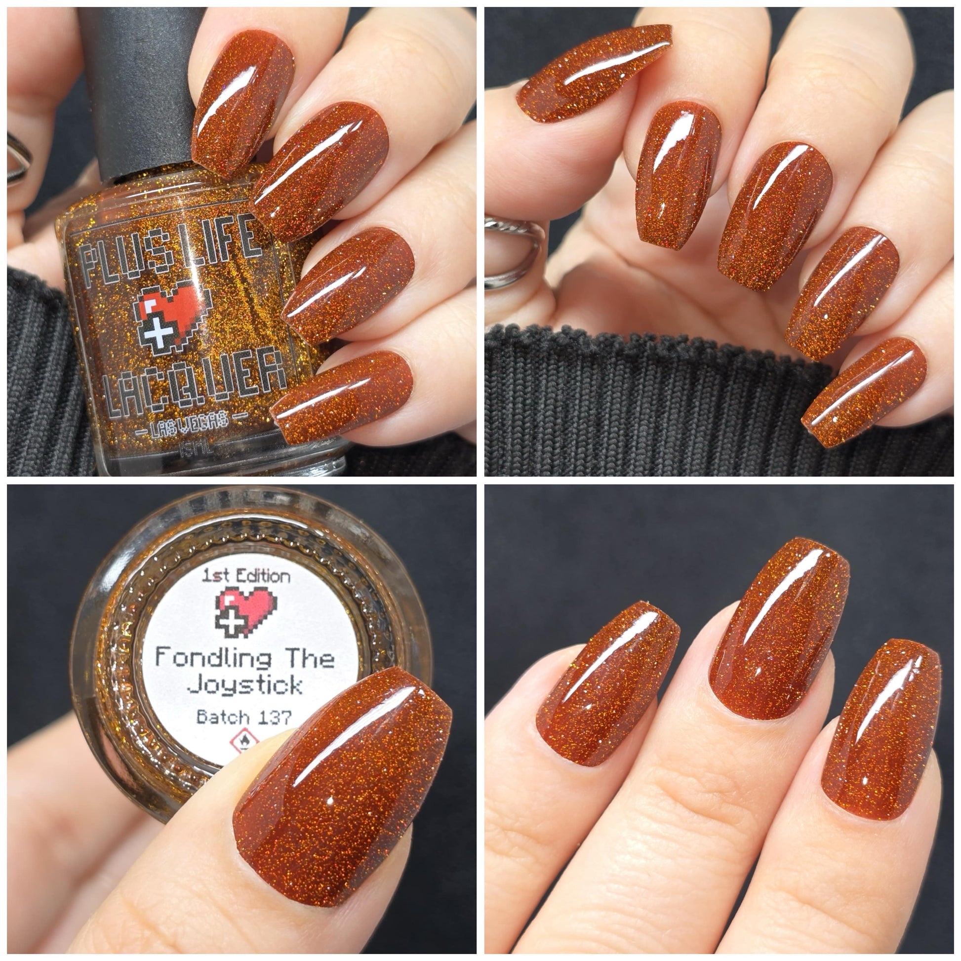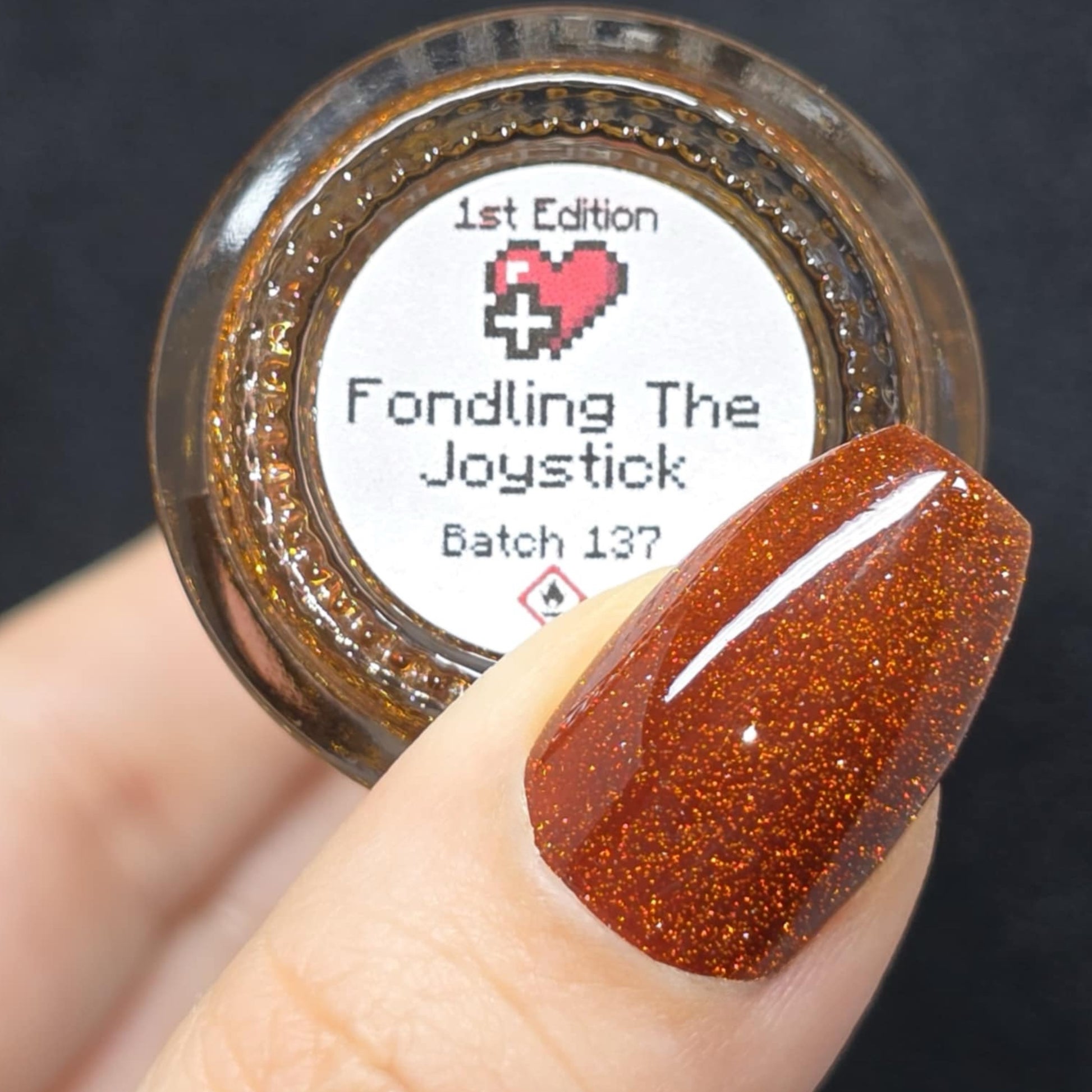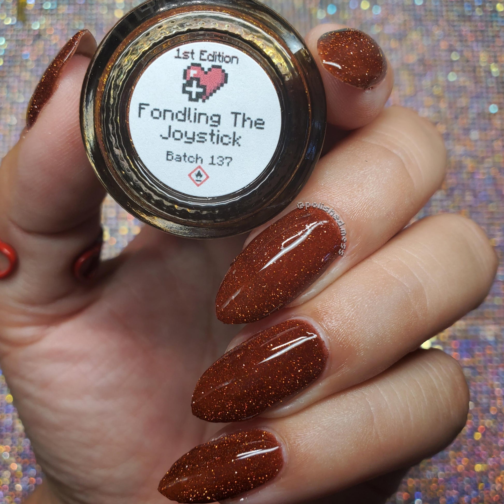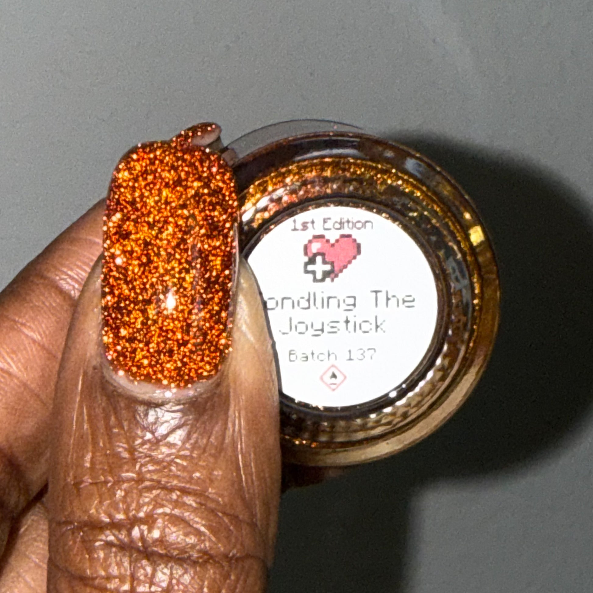 Fondling The Joystick is a burnt umber jelly with gold reflective glitter.