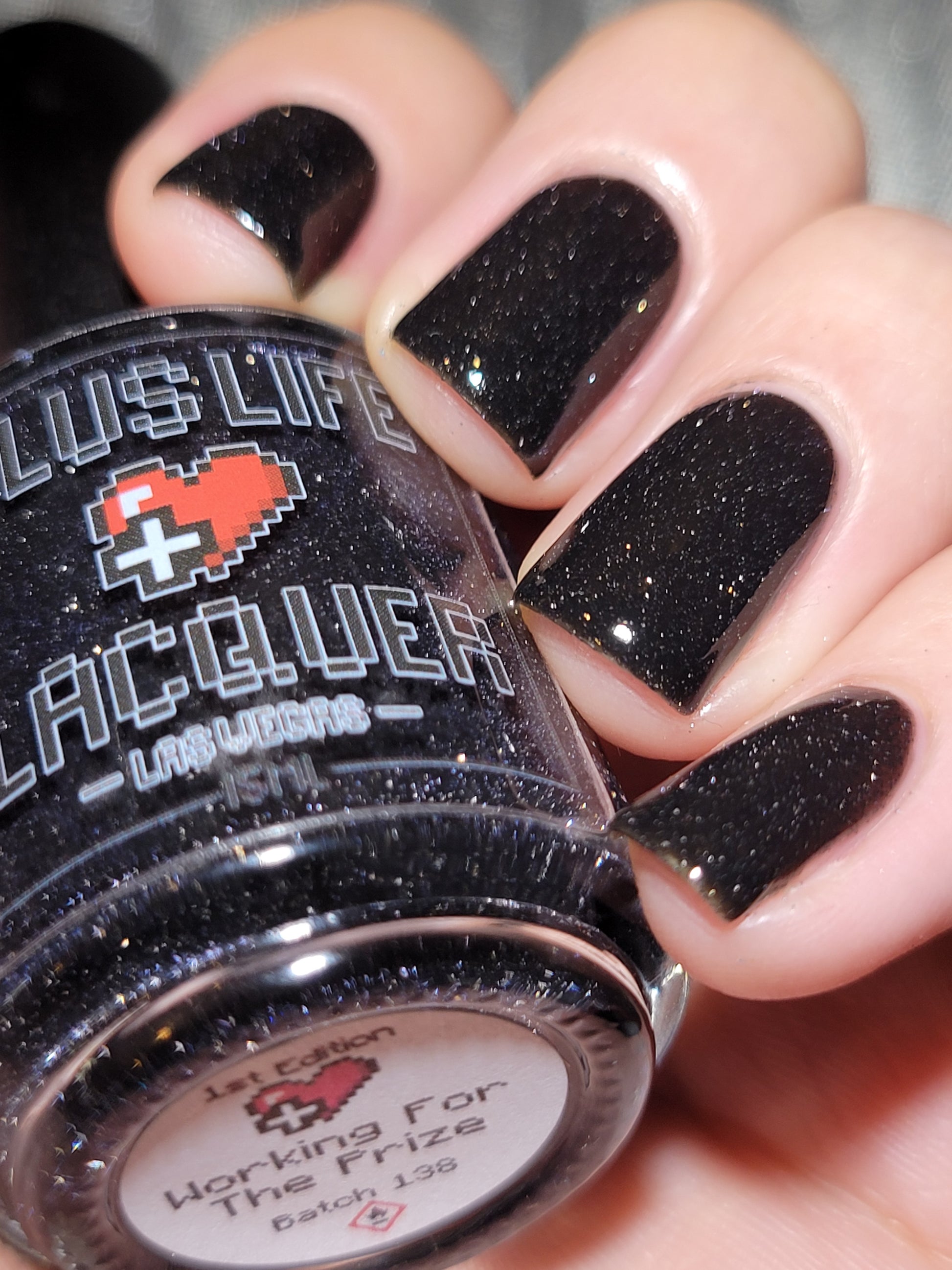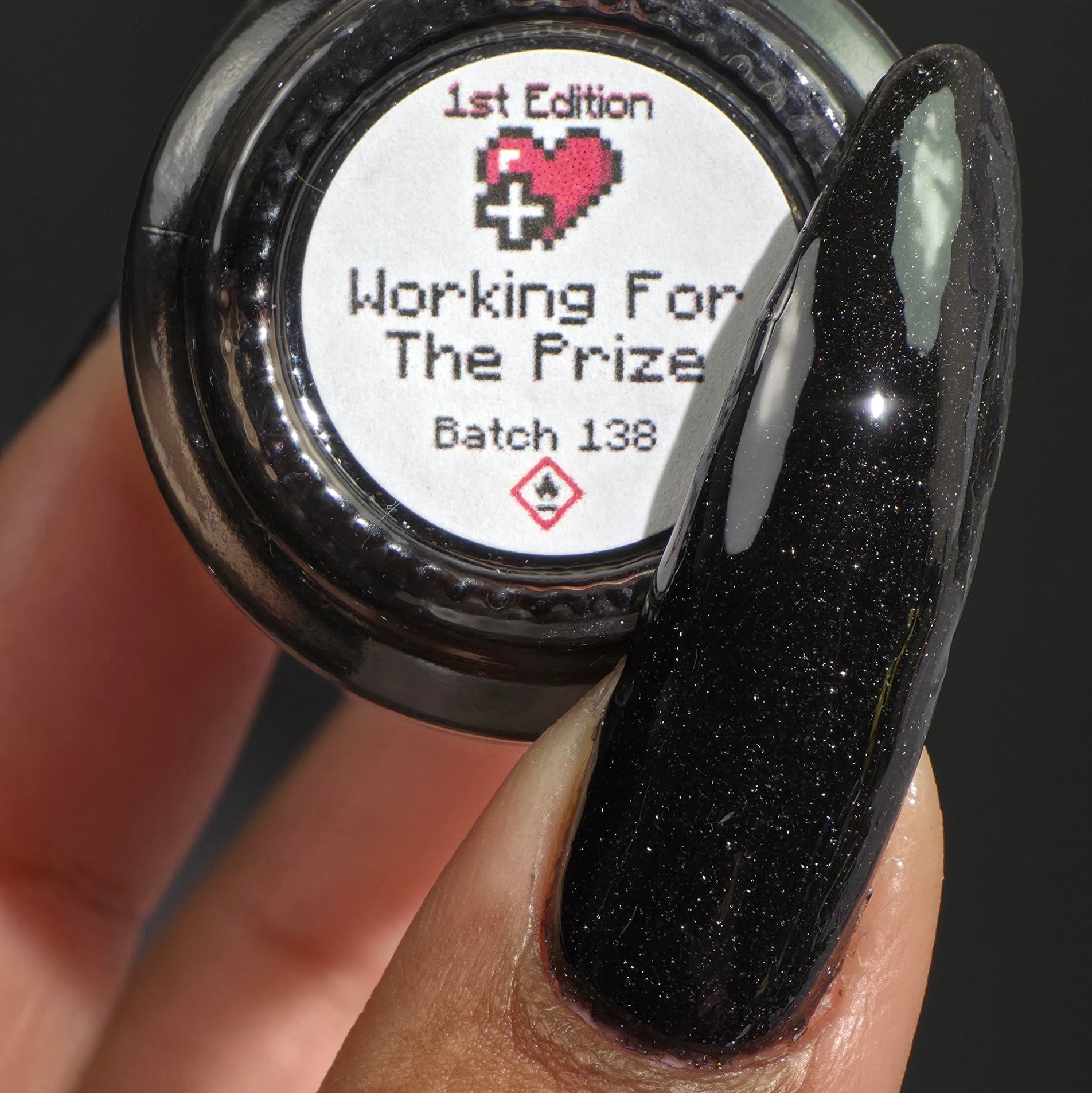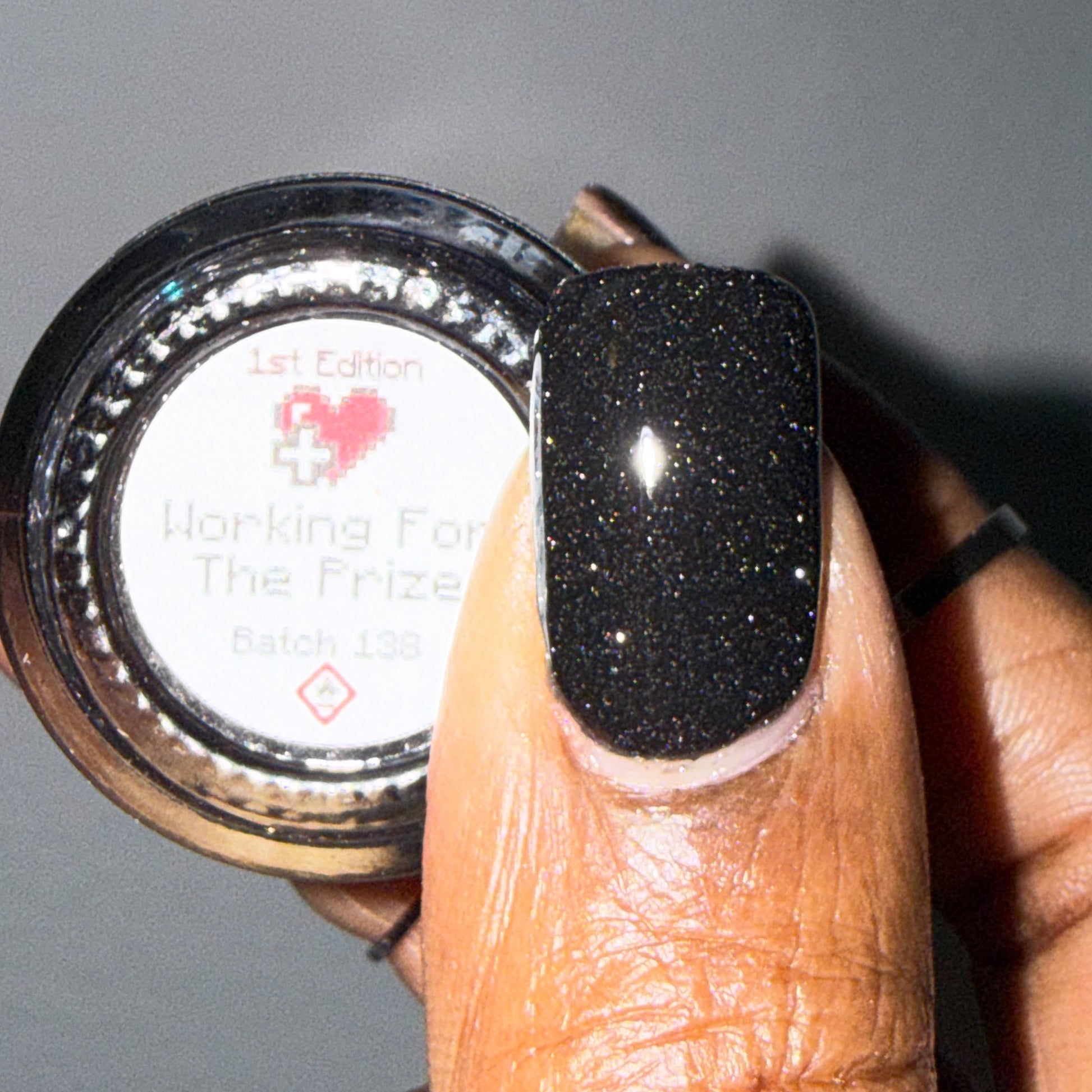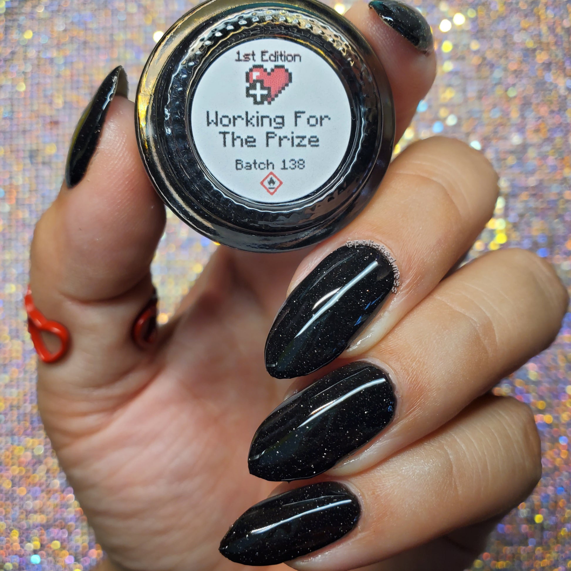 Working For The Prize is a black jelly with black reflective glitter. Because the reflective in this polish is black, the reflective quality may be a little harder to see!